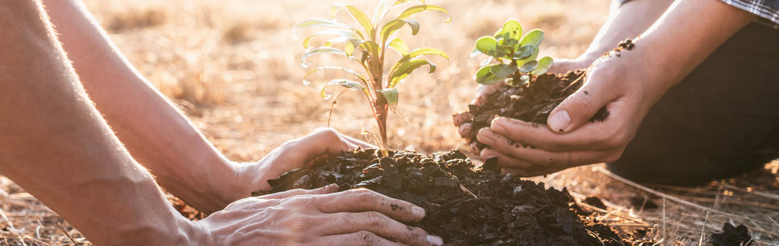 Zwei Hände, die eine Pflanze in die Erde pflanzen